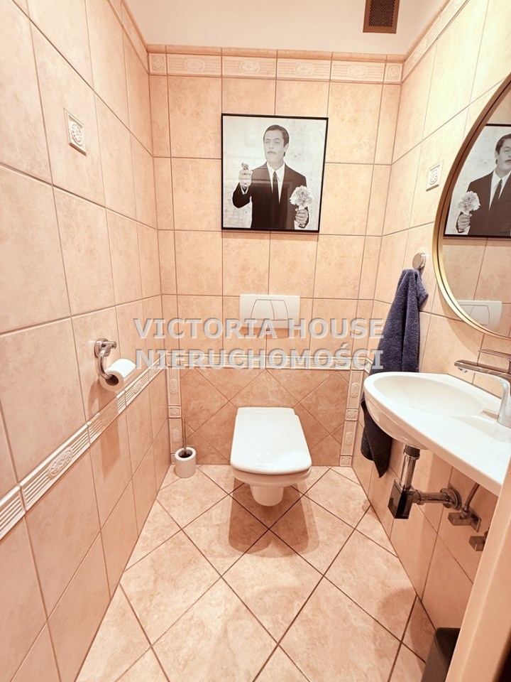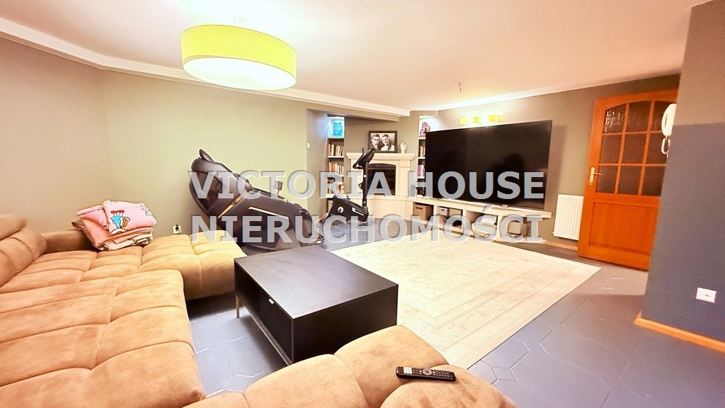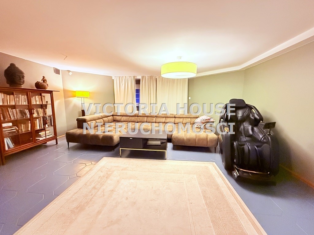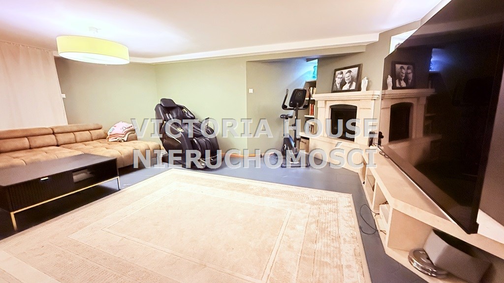 - Piwnica: kilka oddzielnych pomieszczeń gospodarczych, elegancka kuchnia letnia, wyposażony pokój telewizyjny z 90-calowym telewizorem i wygodną kanapą, WC oraz kotłownia. Z piwnicy można wygodnie przejść do garażu i ogrodu.